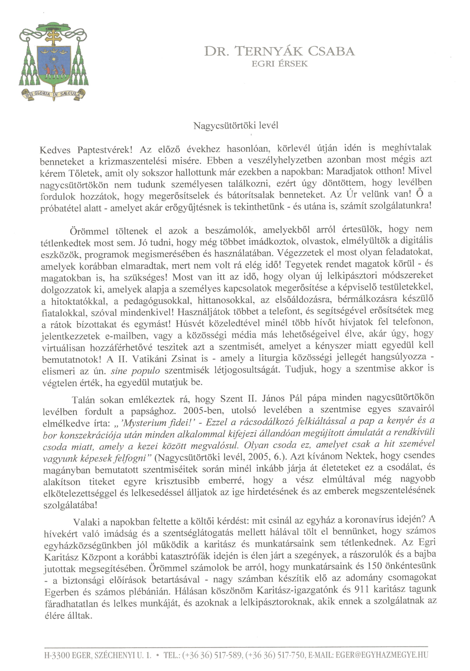 A Szent István Rádió nagycsütörtöki reggeli műsorában intézett beszédet papjaihoz és rajtuk keresztül a hívekhez Ternyák Csaba egri érsek. A főpásztor, mint minden évben, idén is hívta a paptestvéreket a krizmaszentelési szentmisére, most azonban, a rendkívüli helyzet miatt ez halasztást szenved.