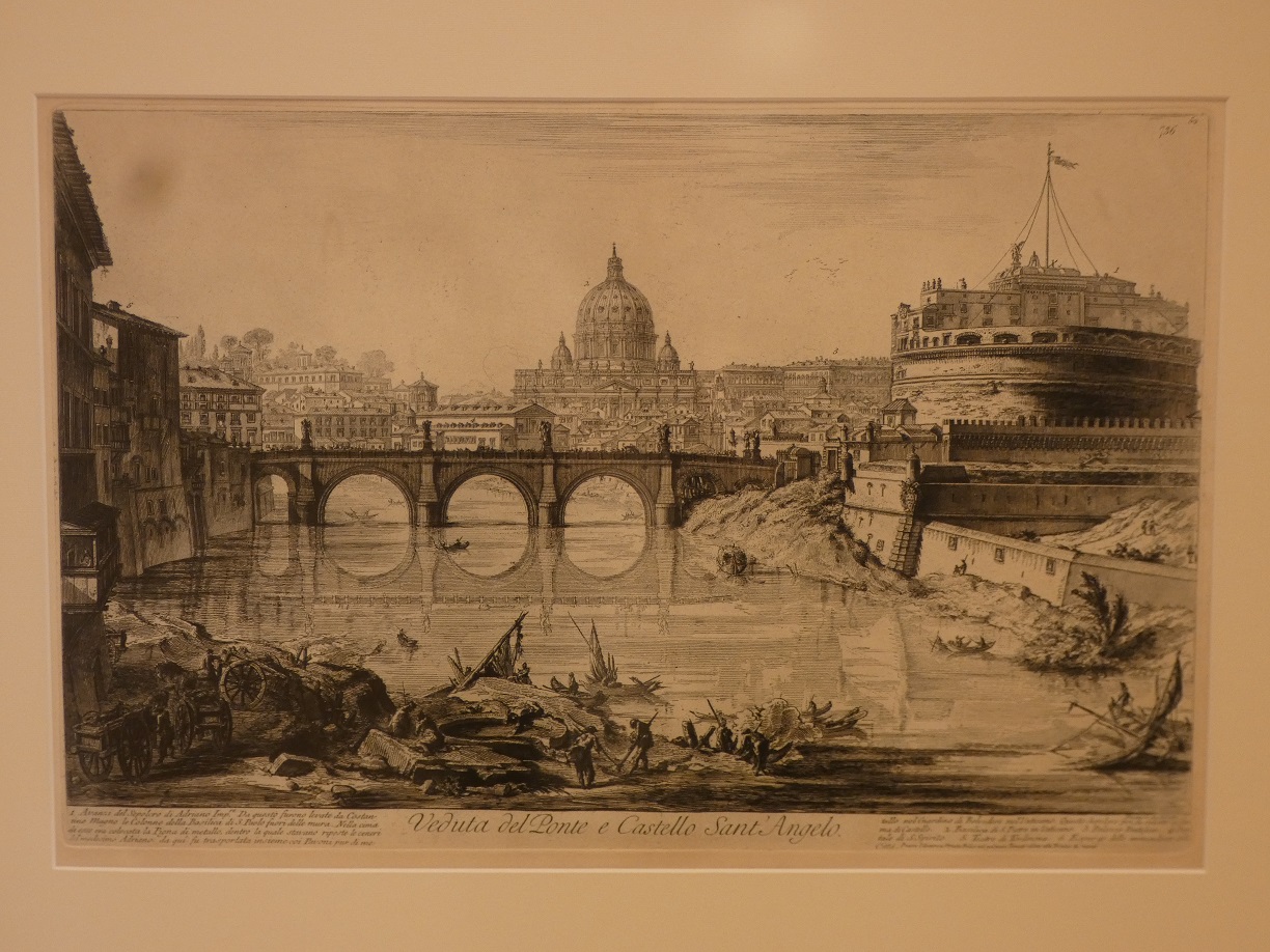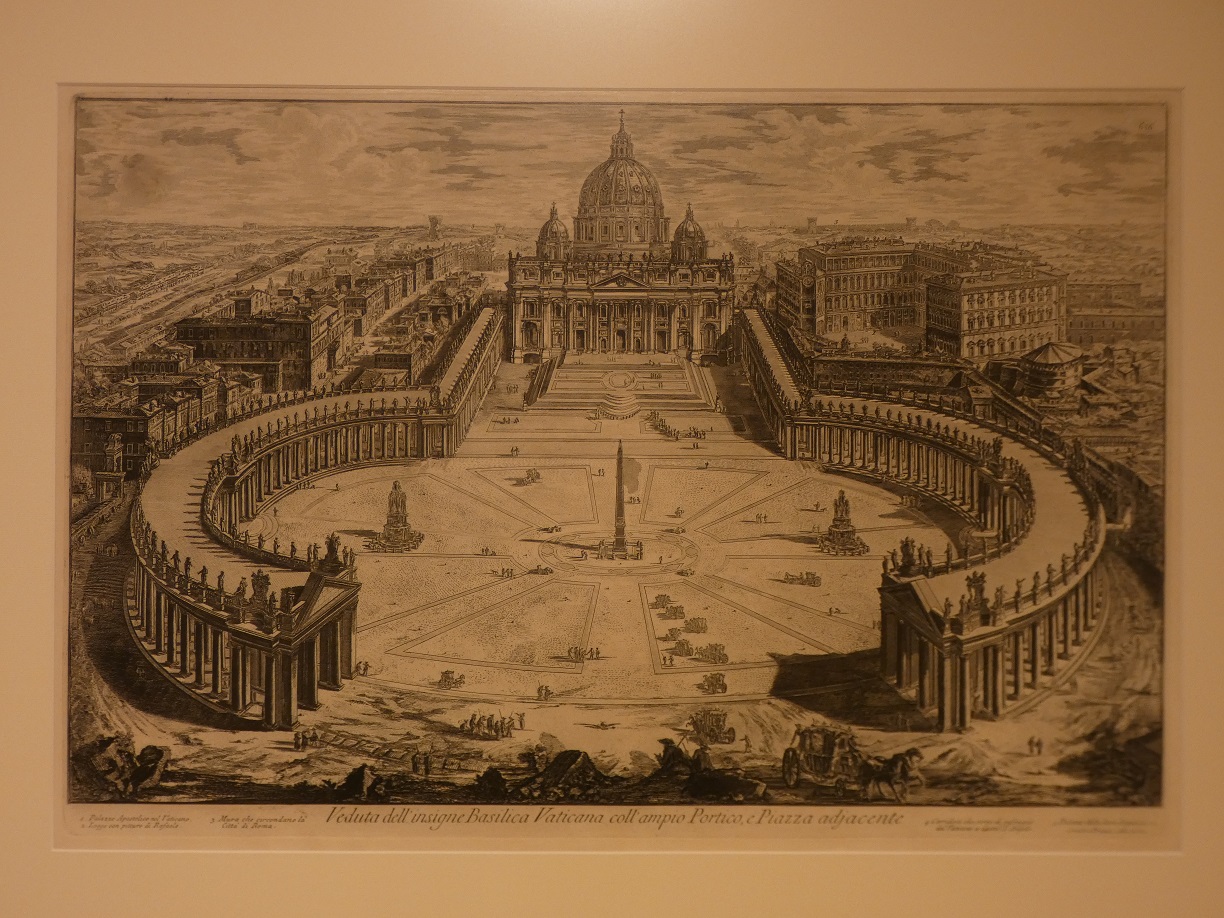 A kiállításban azokban a rézkarcokban szemlélődhet a néző, amelyek az 1761 és 1778 között készült, Vedute di Roma című metszetsorozat lapjai. Ez a széria az örök város antik és barokk építészeti emlékeit mutatja be. E rendkívül népszerűvé váló, nagyméretű római látképeket, valamint az azokból készített kivonatokat számos kiadványban jelentették meg az idők folyamán; itt és az állandó kiállításban, a könyvtárban látható impozáns kötet kiadója a Regia Calcografia di Roma volt a metszetek sarkában látható dombornyomott bélyegzők tanulsága szerint. E Piranesi eredeti metszeteiből összeállított kivonat 1870 és 1945 között számos kiadást megélt. A kötet érdekessége, hogy a borítóján egy bronz címerpajzs látható, amelyen Minervát formálták meg babérágakkal és a Corda Fratres felirattal. Utóbbi egy Torinóban 1898-ban alakult nemzetközi diákszervezet volt, amelynek Budapesten is működött kirendeltsége; a kötetet tehát nagy valószínűséggel ettől a szervezettől kapta valamelyik egri főpap, talán Samassa József érsek.