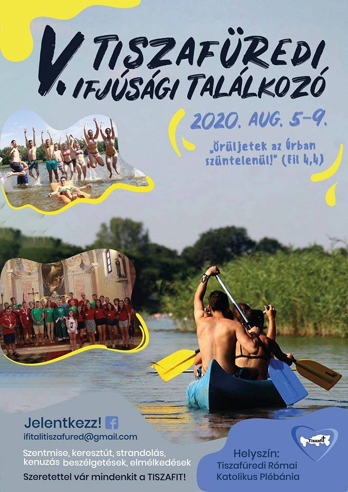 Sok szeretettel hívnak minden 16 és 30 év közötti fiatalt az immár ötödik alkalommal megrendezésre kerülő TISZAFIT-re, vagyis Tiszafüredi Ifjúsági Találkozóra. Programjaik között lesznek előadások, szentmisék, kiscsoportos beszélgetések, strandolás, csónakázás. Várnak mindenkit, aki vágyik a testi és lelki felüdülésre. A pontos információkat a Facebook oldalukon érhetik el az érdeklődők.
