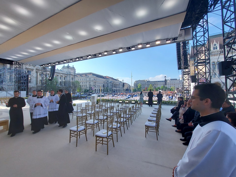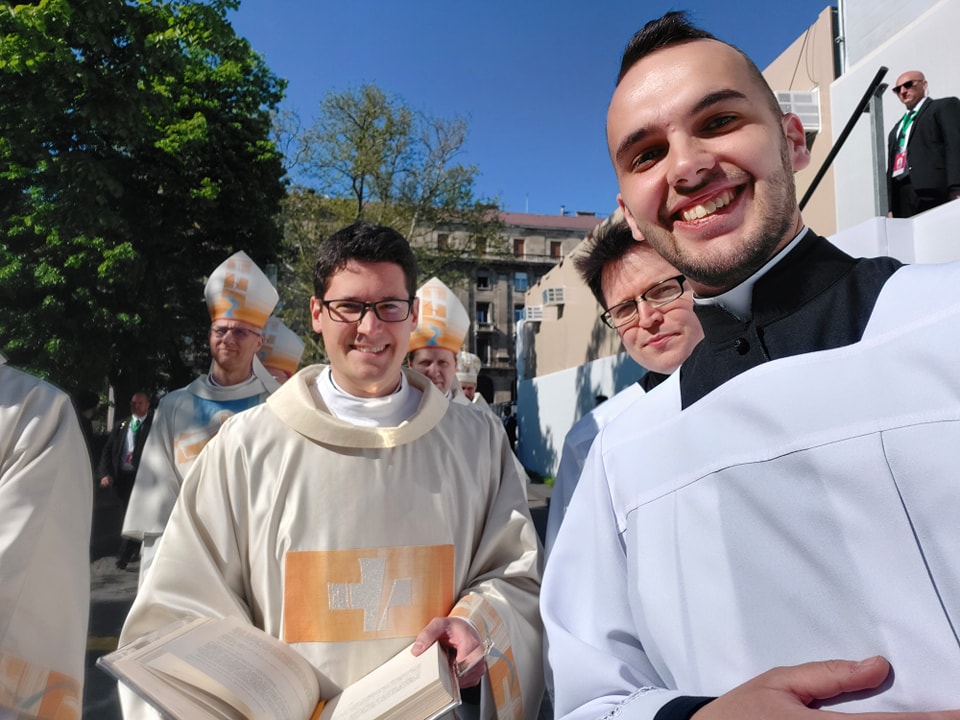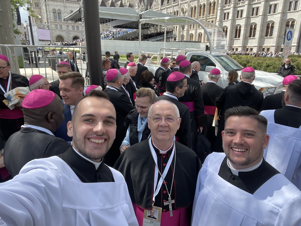 Ha a fizikai készülésre tekintek, elmondhatom, hogy több közös felkészülési alkalom is volt, ötórás próbán vettünk részt szombaton, vasárnap pedig már kora hajnalban ott voltunk a Kossuth téren. Én magam a Ferenc pápával való találkozásra készülve több róla szóló filmet is elővettem, s általában is sokat olvasom a prédikációit, ilyen módon ismerem őt. Mostanában tudatosan hangolódtam az apostoli látogatásra, arra, hogy néhány napon belül eseményről eseményre találkozhatok a szentatyával. Ez kétségkívül nagy öröm volt számomra. A 2021-es Eucharisztikus Kongresszuson már láthattam közelről Ferenc pápát, hiszen a pápamobillal éppen arra fordult, ahol mi, kispapok álltunk. Az, hogy most közösen szolgálhattunk, s a szentmisében rám osztott feladatokat egészen a pápához közel végezhettem, életre szóló élmény. A személyes találkozás akkor történt meg, amikor Ferenc pápa körbement a hívek között, ekkor kezet fogtunk és gyűrűt csókoltam neki, kifejezve a hűségemet őhozzá, egyben az egyházhoz és Jézushoz. Ez a gesztus jelképezi az egységünket is, amit ő jelenít meg a világban.
